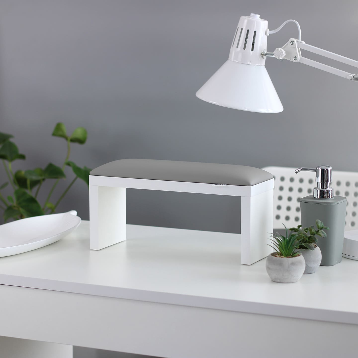 Podpórka do manicure SPENVI Classic w kolorze szarym na białych nogach ustawiona na biurku w salonie kosmetycznym pod lampą. #kolor_cloud