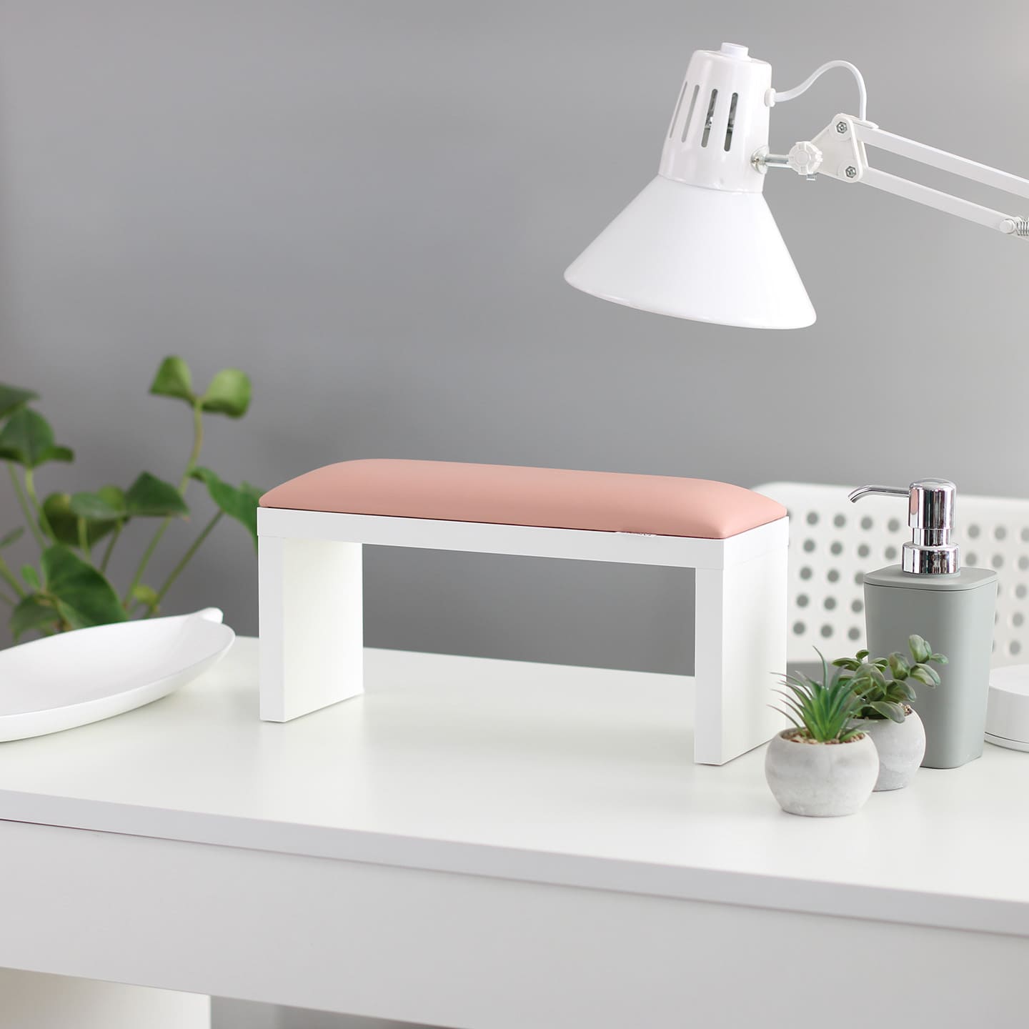Podpórka do manicure SPENVI Classic w kolorze różowym na białych nogach ustawiona na biurku w salonie kosmetycznym pod lampą. #kolor_light-pink