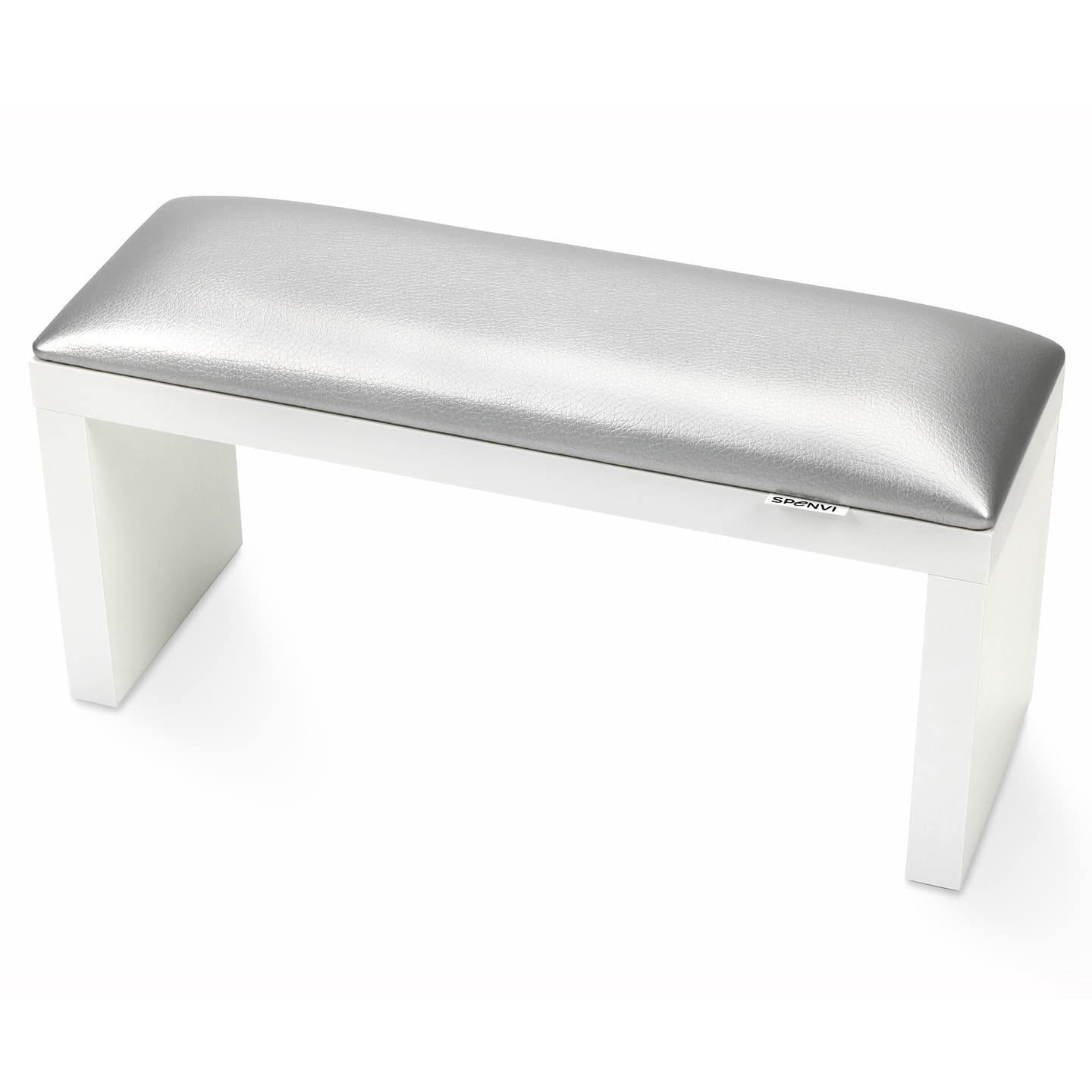 Srebrna podpórka pod rękę do manicure SPENVI Classic na białych nóżkach na białym tle. #kolor_silver